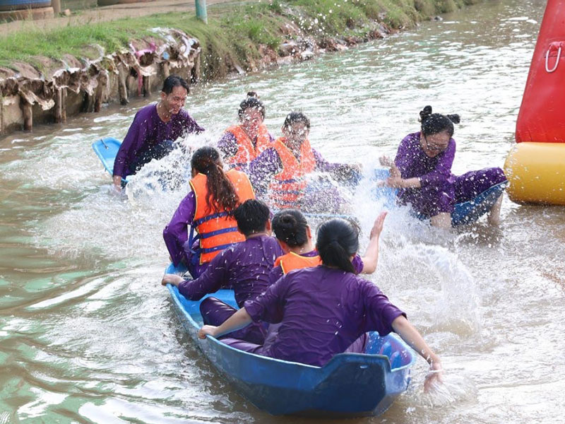 Tham gia các trò chơi sông nước hấp dẫn tại Cồn Phụng: hóa thân thành người nông dân với trang phục bà ba, trải nghiệm tát mương bắt cá, đu dây qua sông, chạy xe đạp qua cầu ván,…