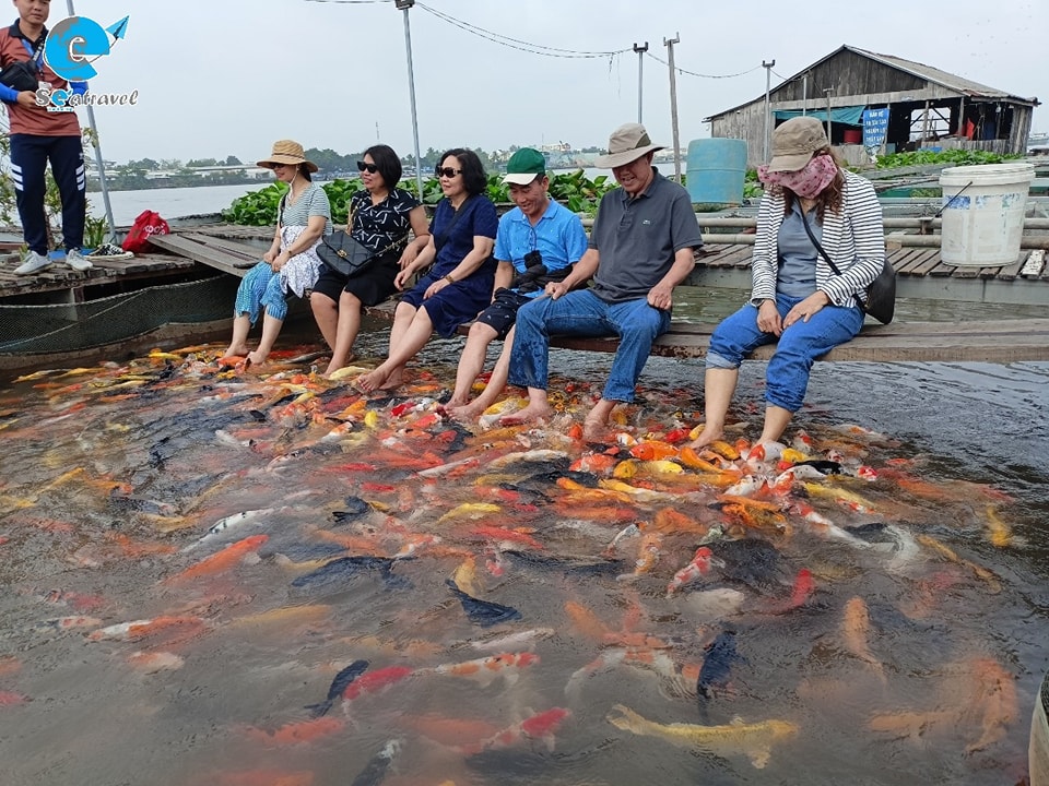 Quý khách ngắm nhìn dòng sông Tiền hiền hòa cùng vùng đất Tứ linh: Long – Lân – Quy – Phụng tìm hiểu cuộc sống nuôi cá bè của người dân địa phương.